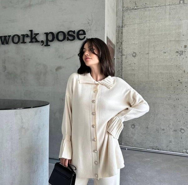 Deze elegante crème tweedelige set biedt de perfecte balans tussen comfort en stijl. Gemaakt van zachte, ademende stof en voorzien van luxe knopen, voegt het een verfijnde touch toe aan je look. Het one-size ontwerp past zich aan verschillende lichaamstypes aan en biedt een flatterende pasvorm. Of je hem casual draagt of opkapt met accessoires, deze set is een tijdloze must-have.