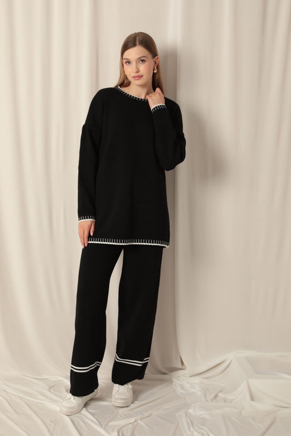 De Oil Black tweedelige set met subtiele witte lijnen biedt een perfecte balans tussen moderne stijl en tijdloze elegantie. Het diepe zwart straalt rust en chique flair uit, terwijl de witte lijnen een eigentijdse twist geven. Gemaakt van zachte, ademende stof, biedt de set zowel comfort als stijl, met een relaxte pasvorm die zich aan verschillende lichaamstypes aanpast. Een veelzijdige must-have voor elke gelegenheid.
